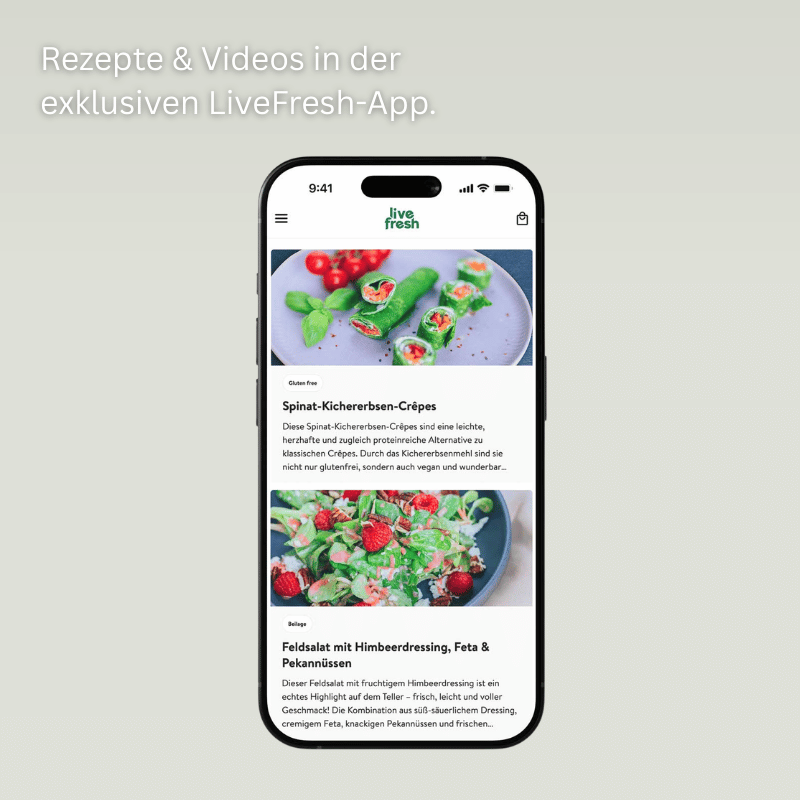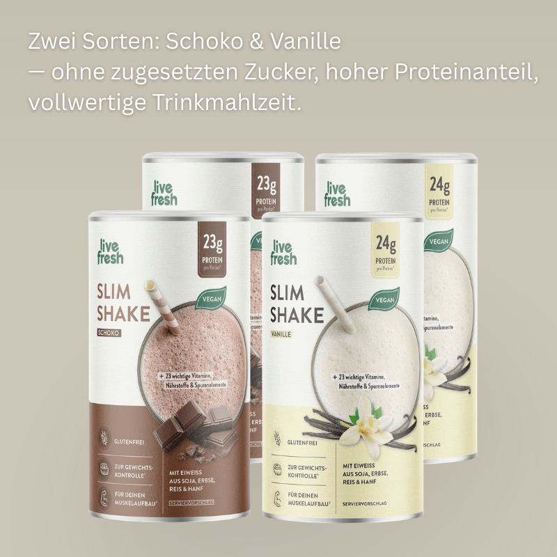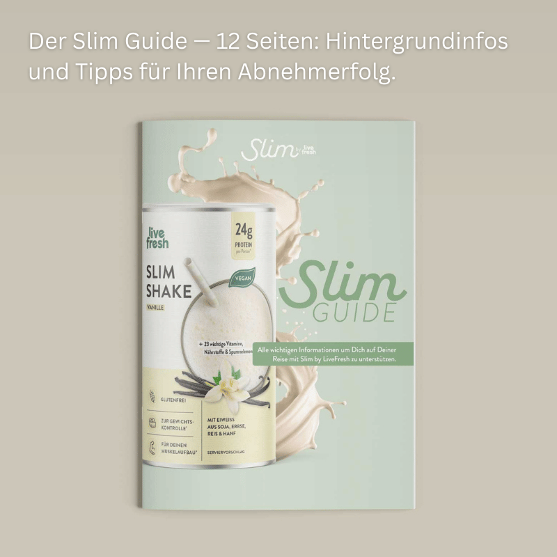 Das Slim Shake LiveFresh – 4-Wochen Starter-Set enthält alles für den Einstieg: Slim Shake Schoko & Vanille, 12-seitiger Slim Guide, Shaker, Messlöffel, Lower Carb High Protein Pasta Fusilli und Zugang zur LiveFresh App mit Rezepten und Videos. Dazu ein wissenschaftlich entwickeltes Konzept, was kein anderer Anbieter im Vergleich liefert.
